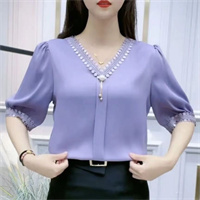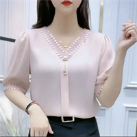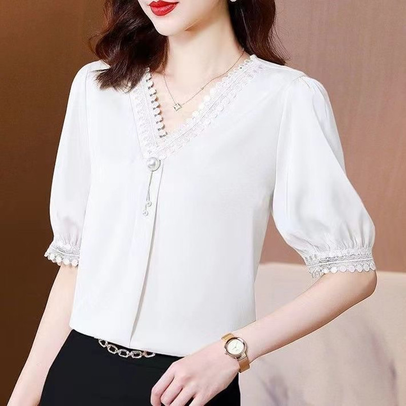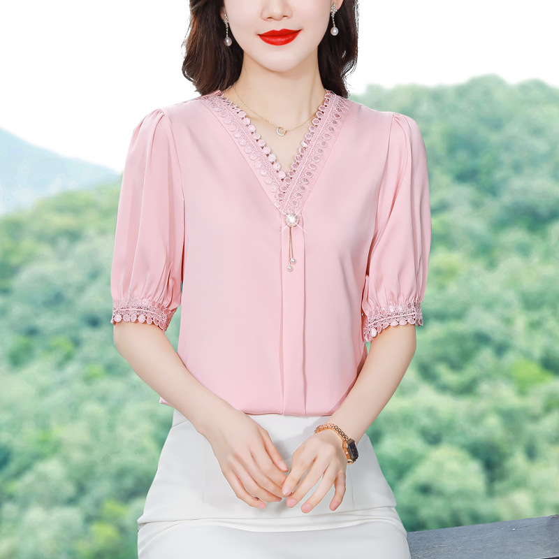 氣質優雅蕾絲拼接V領衫 袖口輕熟風緞面襯衫 純色百搭 顯瘦襯衫